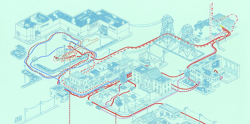 Andrew DeGraff è un insegnante (di arte e design, a Brooklyn, New York) e illustratore che ha collaborato con importanti aziende (Kellogg’s, Visa, Gap) e giornali (Esquire, New York Times e Slate, tra gli altri). Un paio di anni fa ha pubblicato un libro di mappe disegnate a mano e ispirate ai grandi classici della letteratura e ai libri per bambini, come l’Odissea, Orgoglio e pregiudizio, Il giro del mondo in 80 giorni, e Le avventure di Huckleberry Finn. Ora ha fatto lo stesso con le mappe dei film. In Cinemaps ci sono mappe anche molto intricate e ispirate a 35 famosi film, a volte disegnate da DeGraff e commentate dal critico cinematografico A. D. Jameson. Tra i film mappati qui sotto: Shining, Indiana Jones e il tempio maledetto, Lo squalo, Ritorno al futuro e quelli della saga di Star Wars.