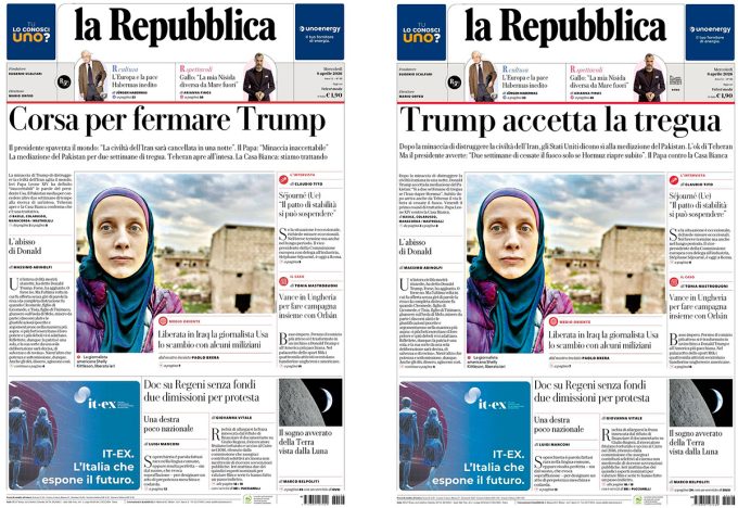 È arrivata dopo la mezzanotte italiana, quando era già mercoledì, la notizia che Donald Trump aveva accettato di discutere un cessate il fuoco con l’Iran, accantonando le sue minacce apocalittiche delle ore precedenti. L’orario è stato particolarmente sfortunato per i maggiori quotidiani italiani, che abitualmente “chiudono” prima di mezzanotte e rendono disponibili le edizioni digitali tra mezzanotte e mezzanotte e mezza. Dei due principali, il Corriere della Sera aveva aspettato e ha poi pubblicato una frettolosa prima pagina con la nuova notizia, mentre Repubblica era già uscita con una versione della prima pagina, che ha poi modificato nel suo titolo maggiore.