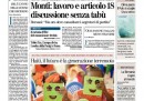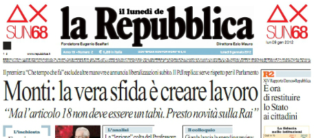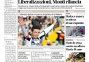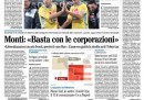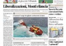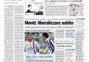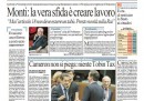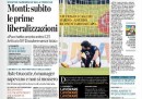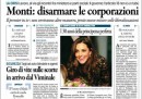 Le prime pagine di oggi aprono con le parole di Mario Monti, ospite da Fabio Fazio su Rai3 ieri sera con ampi consensi ma poche notizie concrete: il Corriere e l’Unità pongono quindi in primo piano il tema delle liberalizzazioni, Repubblica e la Stampa parlano (ancora) dell’articolo 18 e della promessa di “novità” in Rai; Feltri sul Giornale nota con sarcasmo che il Presidente del Consiglio va in televisione con un certo piacere, mentre il titolo maggiore chiede le dimissioni del sottosegretario Malinconico. L’altra notizia viene dall’Europa, dove il premier inglese Cameron si è dichiarato contrario alla Tobin tax, la tassa sulle transazioni finanziarie apprezzata da Sarkozy, e l’Unità pubblica un’intervista con Ferdinando Casini, che prevede un futuro politico per alcuni membri dell’attuale governo.
