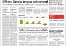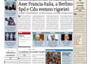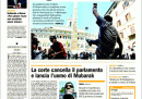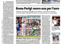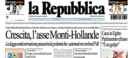 L’incontro di ieri fra il Presidente del Consiglio Monti e il Presidente francese Hollande è la notizia in apertura su molti giornali di oggi, mentre la Stampa si occupa delle tensioni in Egitto dopo l’annullamento delle elezioni e lo scioglimento del Parlamento, il Corriere della Sera apre con un’intervista al capo della Bundesbank, il Giornale propone i risultati di un suo sondaggio che vede gli italiani favorevoli al ritorno della lira e l’Unità commenta l’approvazione da parte della Camera della legge anticorruzione. I quotidiani sportivi aprono con il pareggio dell’Italia agli europei e con il timore di un accordo fra Spagna e Croazia nella prossima partita ai danni dell’Italia.