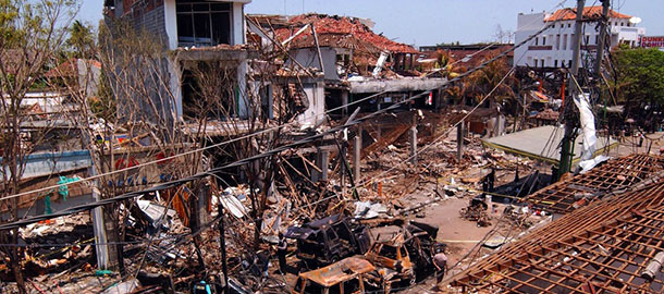 DENPASAR, BALI, INDONESIA – OCTOBER 16: A view of the bomb blast site on October 16, 2002 in Denpasar, Bali, Indonesia. The blast occurred in the popular tourist area of Kuta on October 12, leaving more than 180 people dead and 132 injured, with the death toll expected to rise. (Photo by Edy Purnomo/Getty Images)
