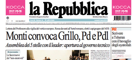 Le trattative per formare un nuovo governo sono in apertura su tutti i giornali di oggi, che titolano per la maggior parte sugli incontri fissati dal Presidente del Consiglio Monti con i leader degli altri partiti Bersani, Berlusconi e Grillo, e sull’assemblea degli eletti del Movimento 5 Stelle a cui ieri ha partecipato anche Grillo, che ha aperto alla possibilità di appoggiare un governo tecnico. Il governo tecnico è l’ipotesi su cui punta anche il Quirinale secondo il piano presentato dal Corriere della Sera e dal Giornale, mentre Libero teme la scelta di Prodi come nuovo Presidente della Repubblica. Il Mattino apre invece con le notizie del crollo di un palazzo a Napoli e dell’incendio che ha distrutto la Città della Scienza.