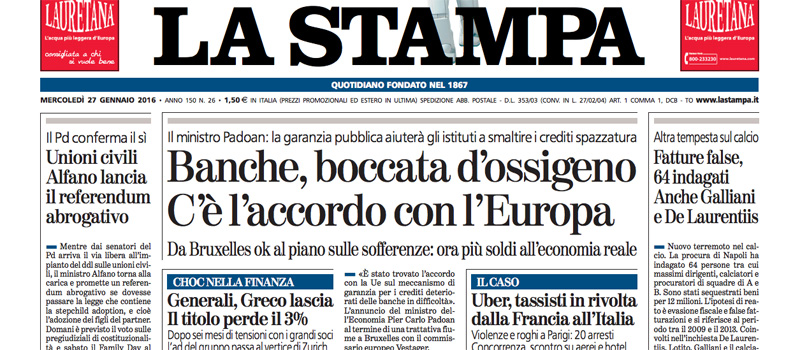 Sulla maggior parte dei giornali di oggi la notizia in apertura è l’accordo con l’Unione Europea annunciato ieri dal ministro dell’economia Padoan sulla gestione delle sofferenze delle banche italiane. Il Corriere della Sera e Libero titolano invece sulle statue coperte in Campidoglio durante la visita del Presidente iraniano Rouhani, l’Unità si occupa della legge sulle unioni civili, sulla quale il PD sembra avere ritrovato una posizione comune, il Giornale apre sulla decisione della Danimarca di confiscare i beni di valore ai profughi per contribuire alle spese per il loro mantenimento, il Fatto commenta il voto del gruppo di Verdini sulla mozione di sfiducia a Renzi e Boschi al Senato, e il Manifesto segue le manifestazioni di protesta degli operai in diverse fabbriche italiane. I quotidiani sportivi aprono con la vittoria del Milan sull’Alessandria nell’andata delle semifinali di coppa Italia e con l’indagine su molte squadre per evasione fiscale.