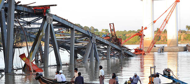 People on a boat work near a damaged bridge in Kyauk Myaung township, east of Shwebo, following a powerful earthquake that hit Myanmar killing at least 13 people, injured dozens and sparking panic in the major central city of Mandalay on November 11, 2012. The shallow 6.8-magnitude quake struck in a rural area 116 kilometres (72 miles) north of Mandalay followed by a series of aftershocks, the US Geological Survey (USGS) said. AFP PHOTO / Soe Than WIN (Photo credit should read Soe Than WIN/AFP/Getty Images)