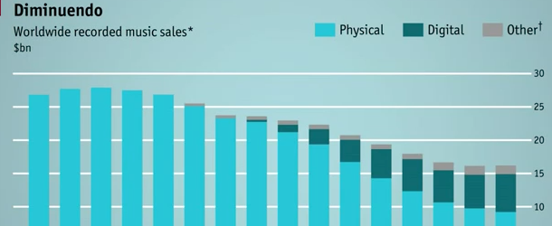 L’Economist ha realizzato un grafico che mostra le vendite di musica nel mondo utilizzando i dati della Federazione Internazionale dei Discografici (IFPI), che ogni anno pubblica un rapporto dettagliato sullo stato della musica (qui c’è il report dedicato alla musica digitale nel 2013). Il grafico mostra come di recente per la prima volta in più di dieci anni ci sia stato un piccolo aumento nelle vendite, dovuto soprattutto alla crescita dei canali di distribuzione considerati ancora “alternativi”, come quelli digitali e le nuove proposte di fruizione in abbonamento (tipo Spotify). Le vendite dei cd infatti hanno subìto una diminuzione costante a partire dal 1999, “prima che internet diventasse mainstream” e la pirateria digitale dilagasse, mentre dal 2004 è cresciuto in maniera straordinaria il mercato musicale digitale, che oggi rappresenta più di un terzo del mercato globale.