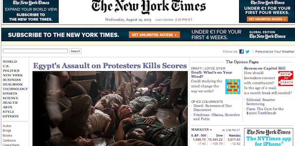 Durante l’interruzione, il NYT ha invitato i suoi lettori a seguire dal suo profilo Twitter legato alle notizie internazionali, @nytimesworld, gli aggiornamenti sulle violenze in Egitto, la notizia più importante del giorno. Ha anche cercato di fornire un servizio essenziale pubblicando alcuni articoli – principalmente riguardanti l’Egitto – sul suo profilo Facebook.