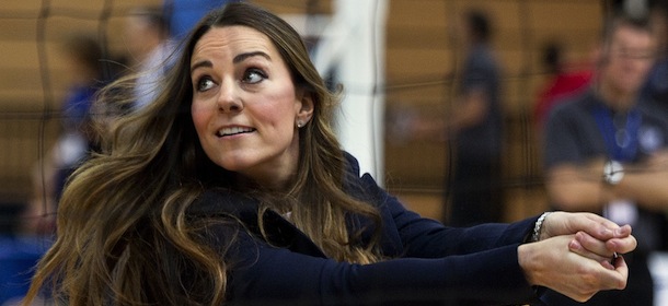 Britain’s Kate, The Duchess of Cambridge plays volleyball during a visit to a SportsAid Athlete Workshop, at the Queen Elizabeth Olympic Park in London, Friday, Oct. 18, 2013. The Duchess of Cambridge as Patron of SportsAid attended a SportsAid Athlete Workshop at the Copper Box where she viewed young athletes taking part in a number of sports activities. (AP Photo/David Bebber, Pool)
