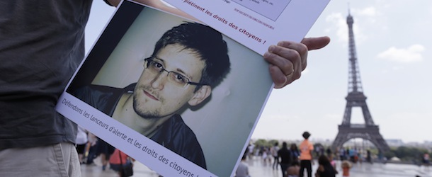 A demonstrator holds up a picture of former technical contractor of the US Central Intelligence Agency Edward Snowden reading “Stand up for whistleblowers and citizen rights!” as people gather at the Place du Trocadero in Paris during a demonstration in support of Snowden on July 7, 2013. Around forty people, mostly activists from organizations defending rights and freedom on the internet gathered in support of Snowden, who leaked information on data spying programs of the USA and Great Britain in June 2013 and has sought asylum in 21 countries, according to WikiLeaks. AFP PHOTO / KENZO TRIBOUILLARD (Photo credit should read KENZO TRIBOUILLARD/AFP/Getty Images)