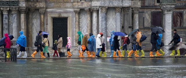 A causa della pioggia, martedì mattina l’alta marea a Venezia ha raggiunto i 124 centimetri sullo zero mareografico (cioè il livello medio del mare misurato nel 1897) ed è rimasta al di sopra dei 120 centimetri fino alle 12. Circa il 37 per cento del centro storico è stato allagato, e in particolare Piazza San Marco, con oltre 40 centimetri d’acqua che hanno costretto passanti e turisti a muoversi sulle passerelle di legno. Secondo i meteorologi la situazione sarà simile anche domani, dove la marea supererà i 120 centimetri verso le 11.