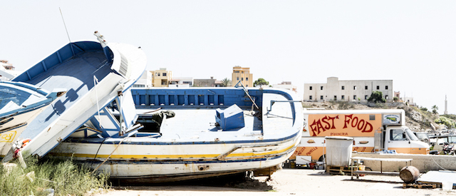 Un futuro possibile, che in parte è già presente, è sicuramente costituito dall’utilizzo del mare a scopi turistici, reso evidente dalla presenza di imbarcazioni adattate all’occorrenza, in parte anche per motivi comprensibili: il carburante qui è merce ancora più preziosa che altrove, dal momento che in nessun altro luogo raggiunge prezzi così alti, rendendo evidentemente molto più onerosa, e molto meno competitiva sul mercato, qualsiasi attività che non ne possa prescindere. E così perlomeno nei mesi “caldi” un ragguardevole numero di barche si trasforma, ospitando al suo interno teli mare e costumi coloratissimi indossati da gruppi eterogenei di persone che si regalano per un giorno un giro in barca dell’isola, in alcuni casi accompagnati da musica dal vivo, e comunque sempre rifocillati con grigliate a sorpresa: perché sarà il mare a decidere quali pesci finiranno nei loro piatti. Ma a Lampedusa anche il turista più scanzonato e desideroso di svago avrà sempre al suo ritorno in porto una visione impressionante nella sua verità: il cimitero di barche. Difficile immaginare qualcosa che più di questa presenza si caratterizzi come documento e monumento allo stesso tempo: è impossibile resistere alla necessità di avvicinarsi, e dopo qualche istante rimanere congelati sotto la luce secca, caldissima e bianca che avvolge questi scafi, che in maniera evidente recano su un fianco, a prua o altrove, i segni del momento in cui la navigazione ha iniziato a rendere ancora più vane le speranze di coloro che ci siamo abituati a chiamare “migranti”, nemmeno da troppo tempo.