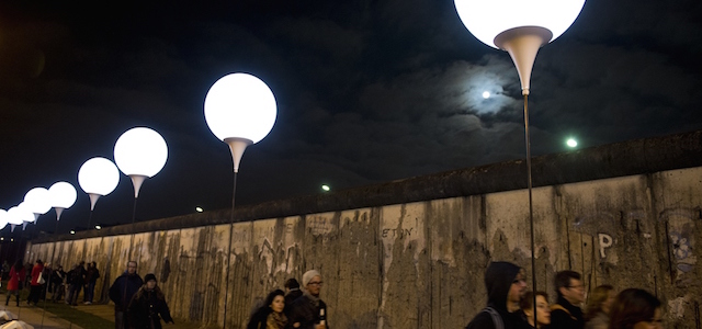 La Caduta del Muro di Berlino, avvenuta esattamente 25 anni fa, è celebrata in questi giorni a Berlino con un’iniziativa inaugurata venerdì sera: si tratta di un’imponente installazione chiamata “I Confini della Luce”, progettata in occasione dell’anniversario della Caduta del Muro di Berlino. In pratica, una lunghissima fila composta da circa 8 mila palloncini bianchi è stata sistemata nei principali quartieri e vie di Berlino lungo il perimetro del Muro che ha diviso la città fino al 9 novembre 1989. I palloncini sono gonfiati con elio e illuminati internamente da un LED, e agganciati in cima a un supporto: somigliano a una specie di lampioni flessibili e resteranno illuminati fino a domenica. Poi, domenica 9, giorno dell’anniversario della caduta del Muro, saranno sganciati dal loro supporto e liberati in cielo. All’inaugurazione era presente anche il sindaco Klaus Wowereit.