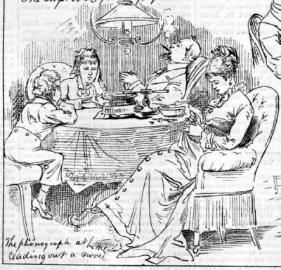 “Il fonografo di casa legge un romanzo”, Daily Graphic, New York, 2 aprile 1878 (The Western Reserve Historical Society, Cleveland, Ohio)