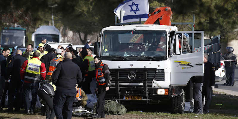 La mattina di domenica 8 gennaio, a Gerusalemme, quattro persone sono morte e almeno sedici sono rimaste ferite dopo essere state investite da un camion sul viale Armon Hanatziv, nella zona sud est della città. Il capo della polizia Roni Alsheich ha detto che è stato un attentato terroristico. I morti, tre donne e un uomo, erano cadetti in corso di addestramento: erano appena scesi da un pullman quando sono stati investiti. L’uomo che guidava il camion è stato ucciso dall’autista del pullman. Un video di una telecamera a circuito chiuso che ha ripreso il momento in cui il camion ha investito le persone alla fermata dell’autobus è stato diffuso su internet (le immagini sono violente).