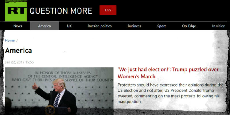 RT è da tempo accusata di diffondere notizie false e propaganda di governo, in particolare nel corso della crisi in Ucraina del 2014. Di recente il network ha attirato nuovamente l’attenzione della stampa internazionale perché è stato esplicitamente definito un canale di propaganda russa nel rapporto redatto da CIA ed FBI sulle interferenze russe nelle elezioni americane. Russia Today è stata fondata nel 2005 e dal 2008 è stata sotto il controllo diretto del governo russo; dal 2009 ha cambiato nome in RT e oggi trasmette programmi in inglese, arabo e spagnolo.