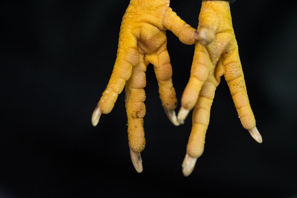Le zampe di una gallina Pencilled Wyandotte fotografate durante la fiera del 2017 a Telford, in Regno Unito (Oli Scarff/AFP/Getty Images)