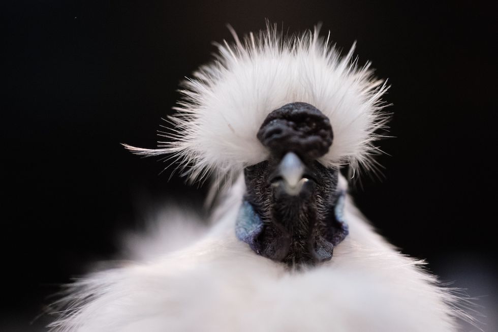Una gallina Silkie bianca fotografata durante la fiera del 2017 a Telford, in Regno Unito (Oli Scarff/AFP/Getty Images)