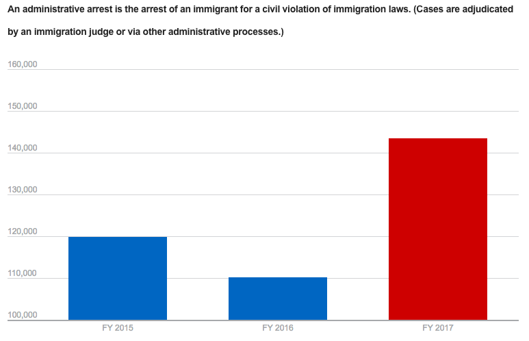 I dati sugli arresti di immigrati irregolari divisi per anno fiscale: occhio, l’anno fiscale 2017 comincia a settembre 2016, quindi comprende anche quattro mesi di amministrazione Obama.
