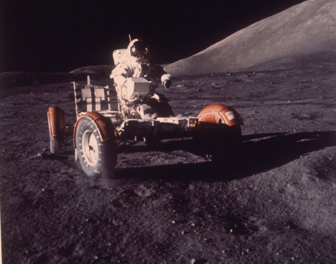 L’astronauta statunitense Eugene Cernan alla guida del Rover lunare durante una delle escursioni sul satellite nel 1972 (AP/NASA PHOTO)