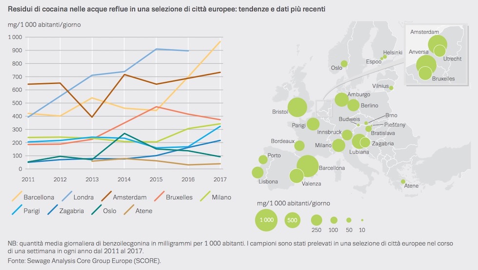 Un dato interessante riguarda Milano, città che partecipa a un programma europeo di analisi delle acque di scolo per la rilevazione di sostanze stupefacenti: tra il 2015 e il 2017 c’è stato un aumento della presenza di cocaina nelle acque della città; non sono state trovate tracce di amfetamine mentre quelle di MDMA e di metamfetamine sono più o meno stabili e non molto alte dal 2012. Le tracce di sostanze sono sempre più alte nei fine settimana.