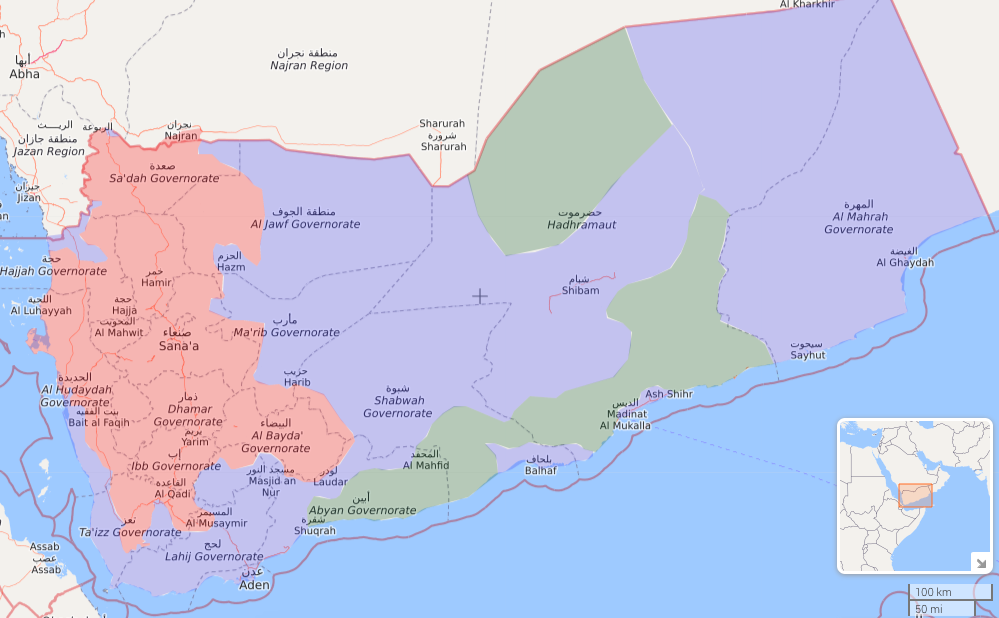 Mappa aggiornata della situazione in Yemen: i rossi sono i ribelli houthi; i blu le fazioni leali all’ex presidente Abdel Rabbo Mansour Hadi, inclusi i sauditi; i verdi sono i jihadisti di al Qaida. La città di Hodeidah si trova sulla costa occidentale, vicino al confine che divide i territori rossi da quelli blu (Liveuamap)