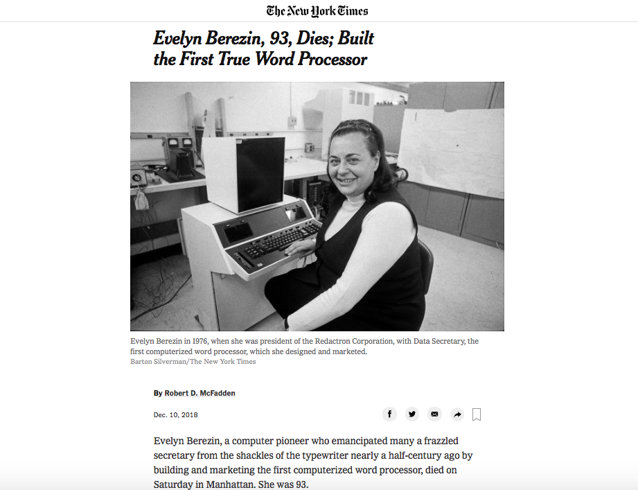 L’8 dicembre è morta a 93 anni Evelyn Berezin, l’informatica statunitense che inventò il primo elaboratore di testi computerizzato (o “word processor”: i software per scrivere, insomma). La notizia è stata data il 10 dicembre al New York Times da suo nipote, secondo cui Berezin aveva scoperto mesi fa di avere un linfoma ma aveva deciso di non curarsi.