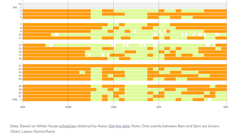 Axios ha calcolato che dal 7 novembre all’1 febbraio, Trump ha passato 297 ore e 15 minuti di executive time, sei volte tanto il tempo che ha passato in viaggio e quasi quattro volte tanto quello che ha impegnato in incontri e riunioni. La tabella pubblicata da Axios non include tutti gli impegni lavorativi di Trump – per esempio ne sono escluse le riunioni organizzate all’ultimo minuto, e solitamente ce ne sono un paio al giorno – ma aiutano a farsi un’idea di come Trump passi il tempo.