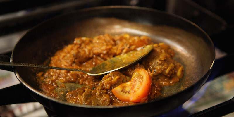Anche il cibo che i britannici conobbero in India è il risultato di un sincretismo nato da invasioni e scambi commerciali. Come ha raccontato sempre all’Atlantic Lizzie Collingham – storica del cibo e autrice di Curry: A Tale of Cooks and Conquerors – la cucina dell’India del Nord venne profondamente influenzata dall’invasione dei Moghul, una dinastia che discendeva dal conquistatore turco-mongolo Tamerlano e che dominò il paese dal 1526 fino all’imporsi dell’Impero britannico nel 1858. I Moghul introdussero la cucina persiana, con il suo riso basmati molto aromatico e la carne marinata a lungo. Le salse cremose, il kebab (cioè carne a pezzettini infilzata su uno spiedo e grigliata) accompagnata dal riso, gli ingredienti costosi come zafferano, mandorle e pistacchi, sono tutti elementi di origine persiana portati dai Moghul. È così che nacque per esempio il biryani, uno dei più famosi piatti indiani, fatto di carne marinata (manzo, pollo o agnello) nello yogurt, quindi cotta e servita con riso speziato.