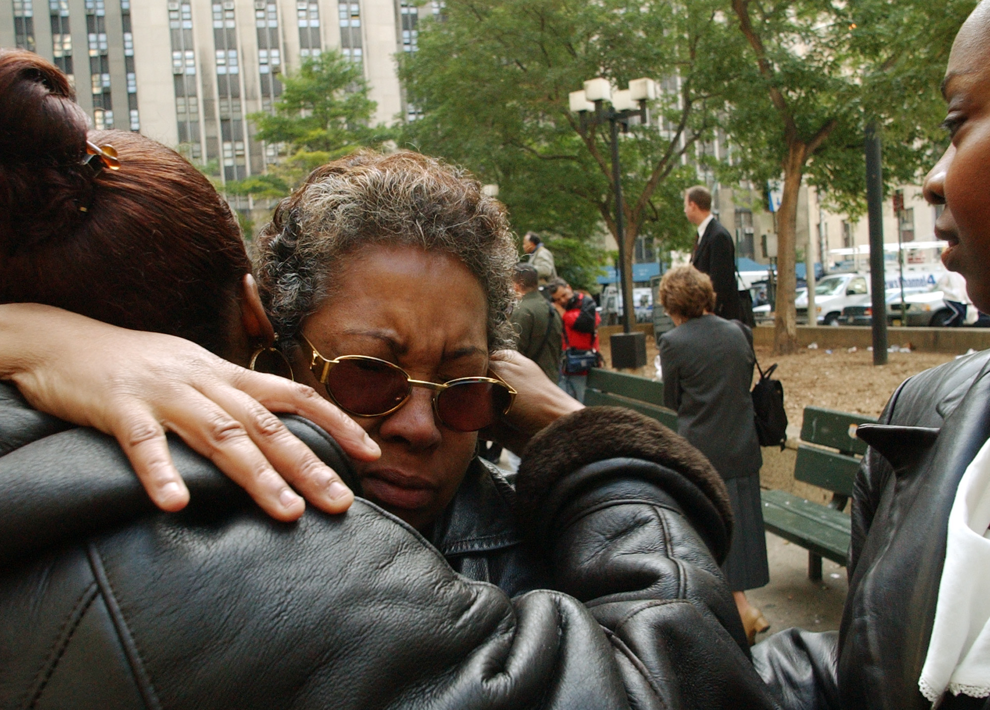 Dolores Wise, madre di Korey Wise, di fronte alla Corte Suprema di Manhattan durante una manifestazione, il 21 ottobre 2002, quando ancora la sentenza di suo figlio e degli altri quattro condannati non era stata annullata (AP Photo/Robert Mecea)