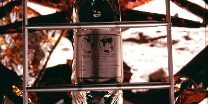 22. Una targa applicata su una gamba di atterraggio del Modulo Lunare, e quindi rimasta sulla Luna, mostra la Terra e ha le firme dei tre astronauti dell’Apollo 11 e di Richard Nixon, all’epoca presidente degli Stati Uniti. Nixon fu anche il primo presidente a rispondere a una telefonata dalla Luna, quando il centro di controllo di Houston mise in comunicazione Armstrong e Aldrin con la Casa Bianca per un saluto.