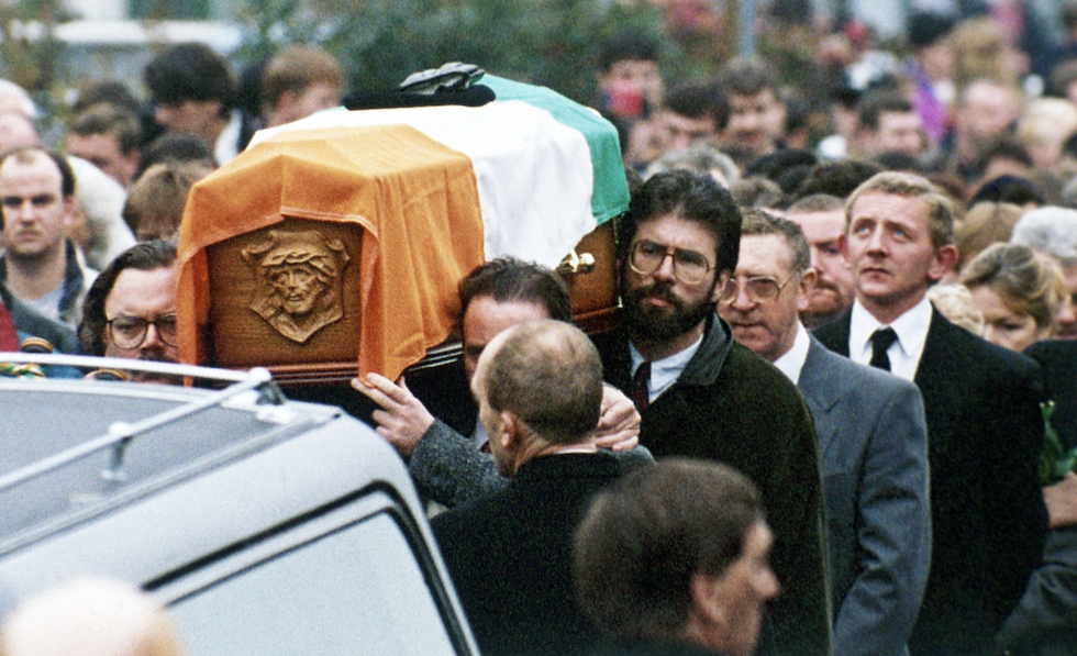 Gerry Adams aiuta a portare la bara di Thomas Begley, membro dell’IRA e autore dell’attentato di Shankill Road, il 27 ottobre 1993 (AP Photo)