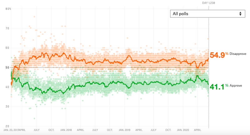 La seconda è che queste settimane non sono il periodo peggiore in assoluto per il consenso di Trump. Secondo una media calcolata da FiveThirtyEight, oggi Trump ha un tasso di popolarità del 41,1 per cento, mentre il suo operato non piace al 54,9 per cento degli americani. È un dato basso ma non bassissimo: era stato inferiore sia nei primissimi mesi del suo mandato sia nei primi mesi del 2019. Nonostante le apparenze – che riguardano soprattutto la sua gestione disastrosa della pandemia da coronavirus e delle estese proteste per il razzismo – Trump non è nel momento peggiore del suo mandato per quanto riguarda il tasso di approvazione del suo operato.
