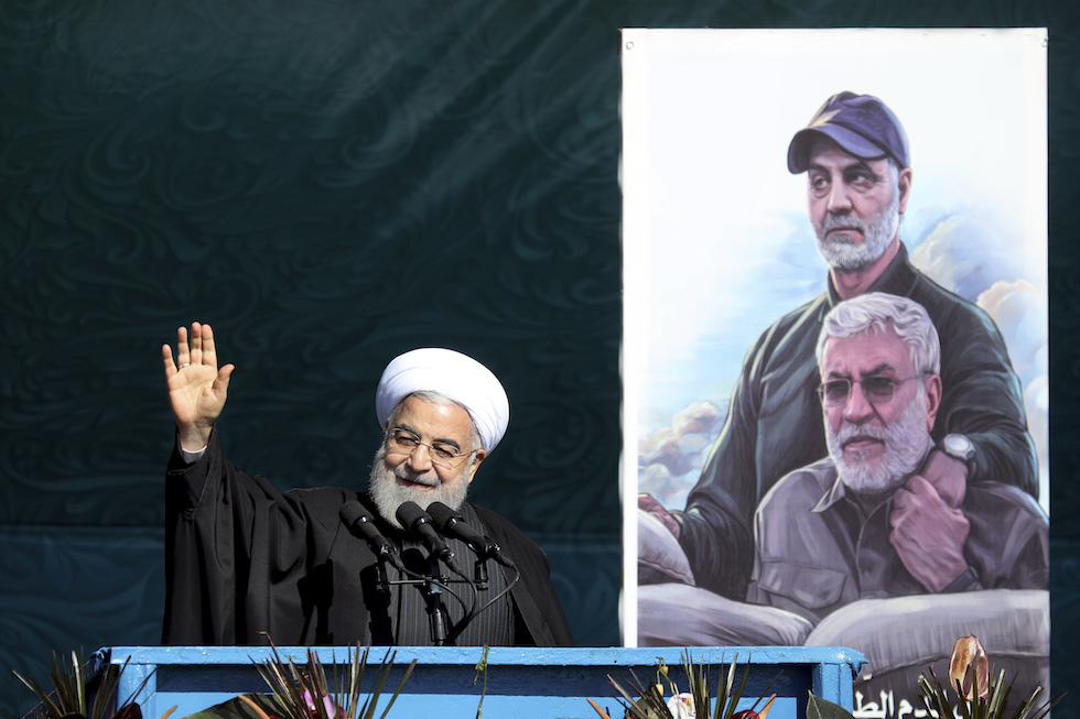 Il presidente iraniano Hassan Rouhani di fianco a una foto che ritrae il generale Qassem Soleimani (dietro) e il comandante di una milizia sciita, Abu Mahdi al Muhandis (AP Photo/Ebrahim Noroozi)