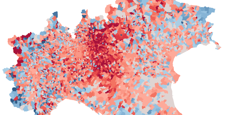 In questa mappa, invece, è rappresentata la variazione percentuale del numero di morti dal 1° gennaio al 30 settembre 2020. Anche in questo caso, si può selezionare la regione, la provincia o il comune. Scorrendo il puntatore del mouse sulle aree colorate, si possono leggere i dati. Come si può vedere, le aree con l’aumento più significativo sono le regioni del nord, e in particolare le province di Bergamo e Brescia.