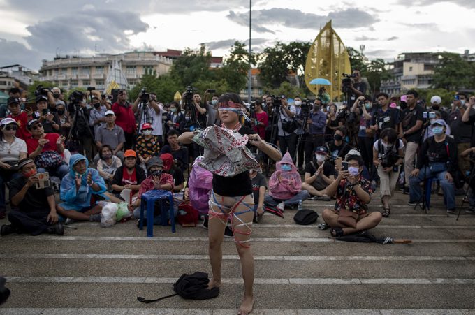 Performance di una studentessa durante le proteste, Bangkok, 23 agosto 2020 (AP Photo/Gemunu Amarasinghe)