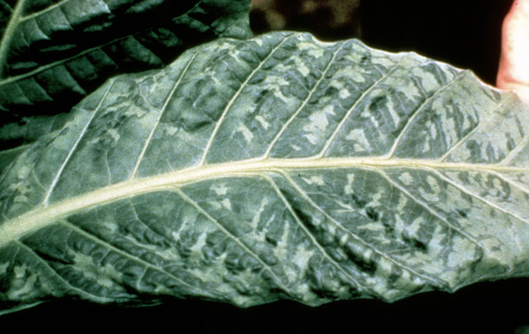 Gli effetti della malattia causata dal virus su una foglia di tabacco (Wikimedia)