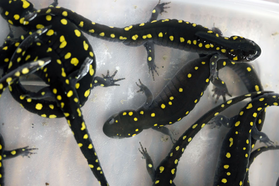 Salamandre maculate in un laboratorio ad Avon, nello stato di New York (AP Photo/David Duprey)