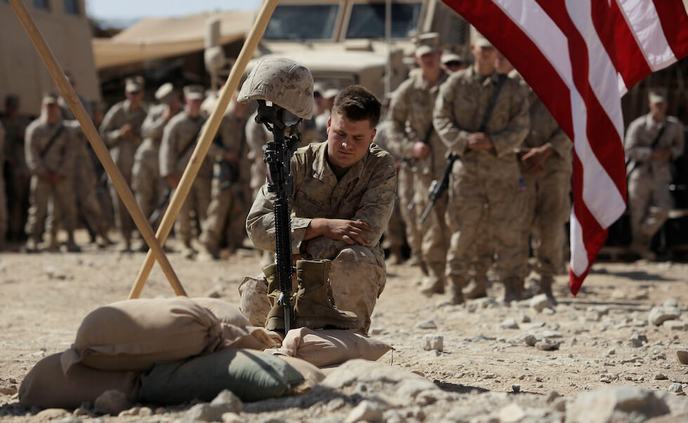 Un marine statunitense durante la commemorazione del soldato Joshua Bernard ucciso in un attacco talebano (AP Photo/Julie Jacobson, File)