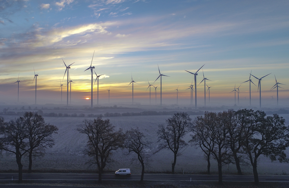 L’alba dietro il parco eolico “Odervorland” nello stato tedesco del Brandeburgo (Patrick Pleul/picture-alliance/dpa/AP Images)