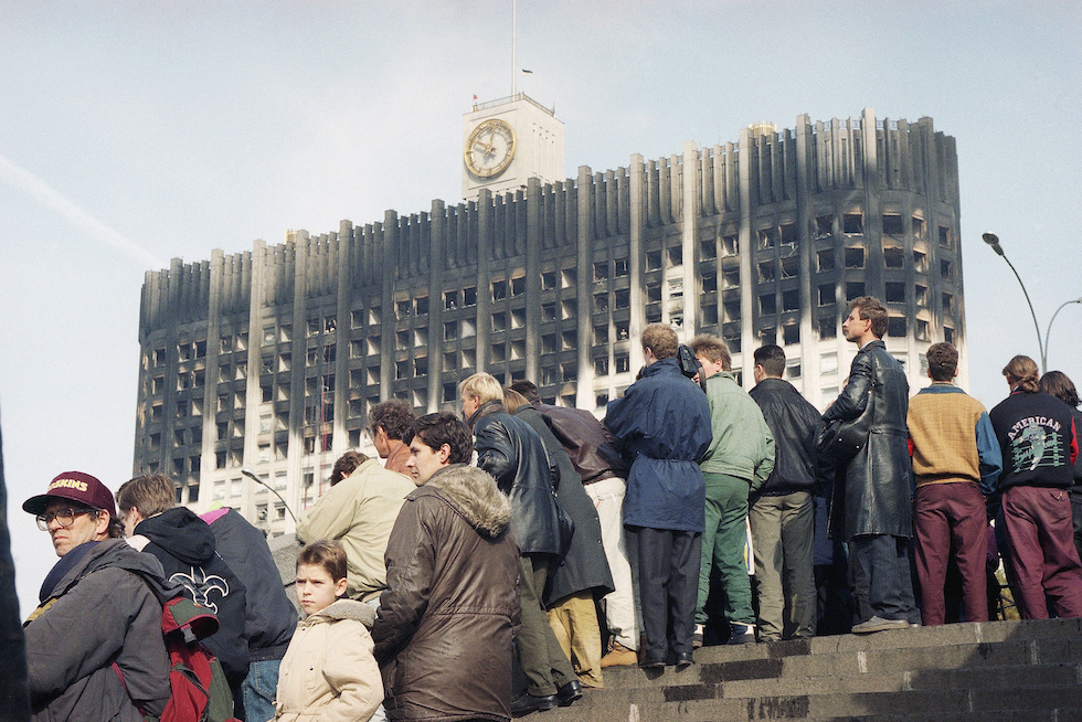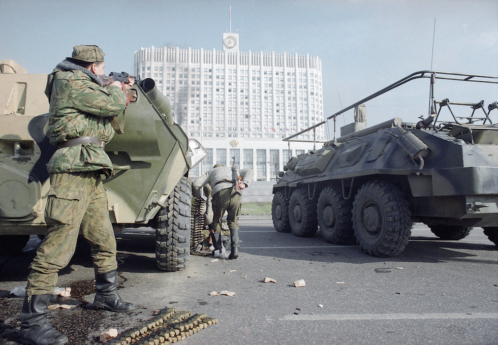 Il 4 ottobre 1993 una grave crisi politica in corso da mesi tra l’allora presidente russo Boris Eltsin e il parlamento sfociò in un conflitto armato in cui i carri armati schierati a Mosca colpirono su ordine del presidente la sede del parlamento occupata dai suoi oppositori politici. Il numero di persone morte non fu mai chiarito, ma secondo le stime dell’epoca furono almeno 147. Fu la cosa più vicina al primo colpo di stato nella storia della Federazione russa, dopo che un precedente tentativo fallito nel 1991 aveva avviato gli eventi che portarono alla dissoluzione dell’Unione Sovietica.