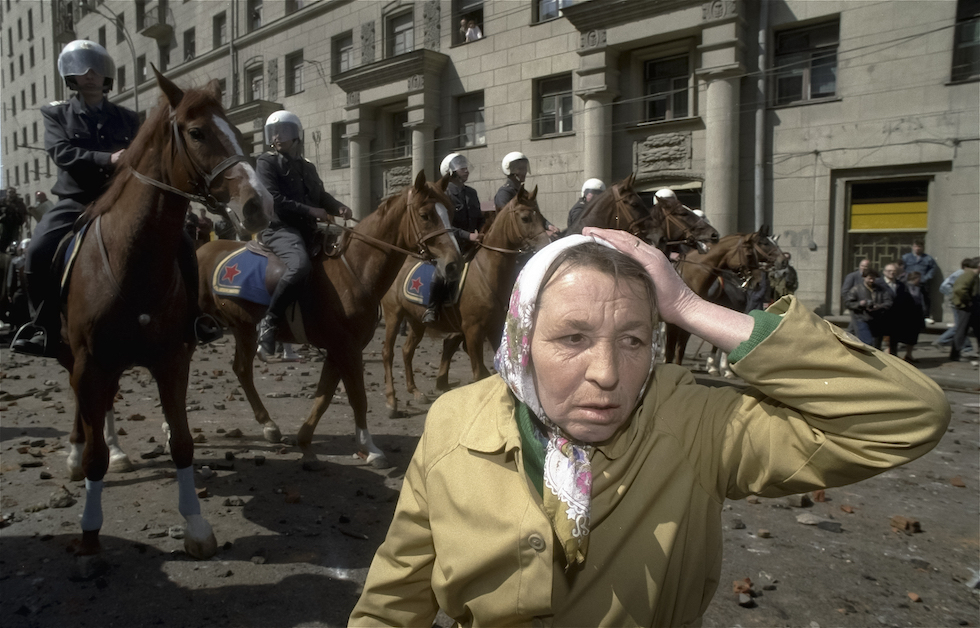 Una donna attraversa una strada pattugliata dalla polizia a cavallo, a Mosca, il 1° maggio 1993 (AP Photo/Alexander Zemlianichenko)