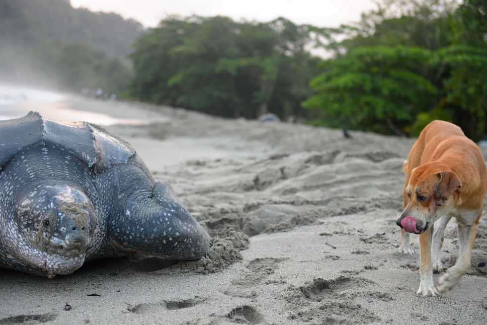 Una tartaruga liuto su una spiaggia di Trinidad, vicino a un cane, nel 2013 (AP Photo/David McFadden)