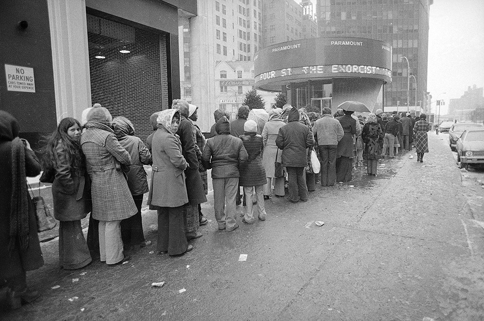 Una fila di persone in attesa di vedere “L’esorcista” al Paramount Theater, a New York, il 4 febbraio 1974 (AP Photo/Ron Frehm)