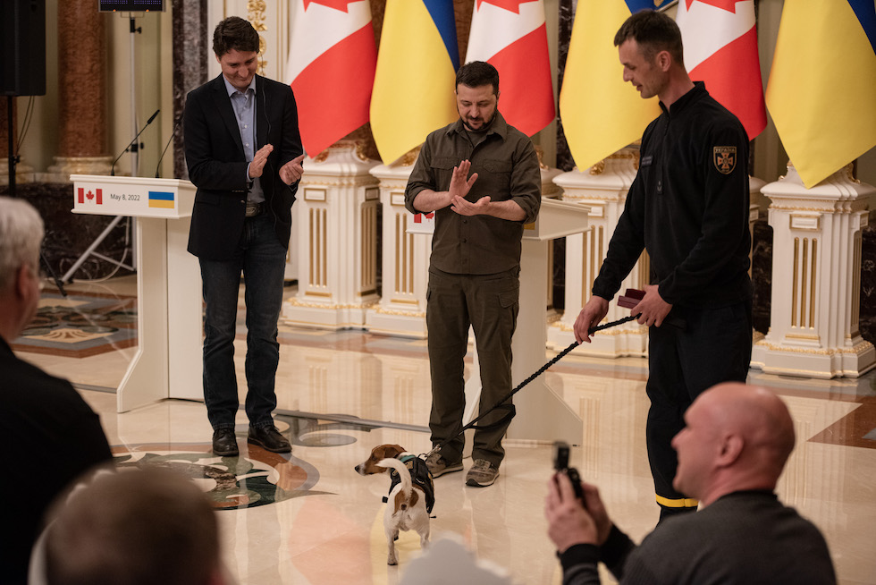 Il presidente ucraino Zelensky (al centro) e il primo ministro canadese Justin Trudeau (a sinistra) danno una medaglia al cane Patron (Alexey Furman/Getty Images)