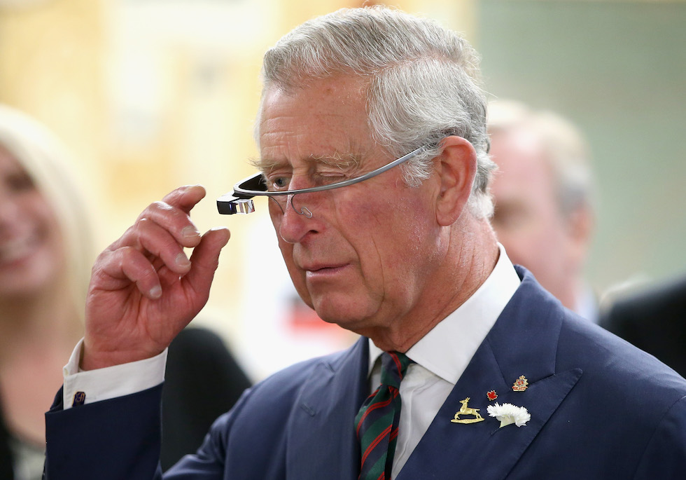 L’allora principe Carlo del Regno Unito con i Google Glass, nel 2014 (Chris Jackson/Getty Images)