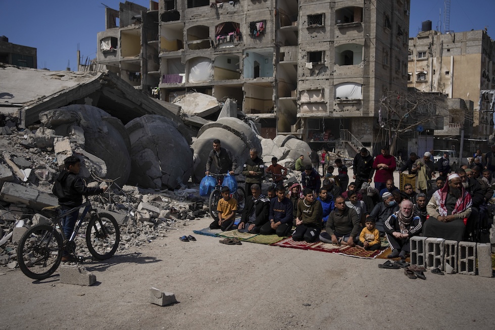 Palestinesi di fronte a una moschea distrutta a Rafah (AP Photo/Fatima Shbair)