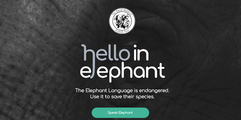 Hello in elephant è un progetto che ha lo scopo di far conoscere la condizione degli elefanti africani (che sono in pericolo di estinzione a causa del bracconaggio e dell’utilizzo del loro habitat da parte dell’uomo) attraverso un’applicazione che traduce brevi messaggi dall’inglese ai suoni che questi animali utilizzano per comunicare tra loro.