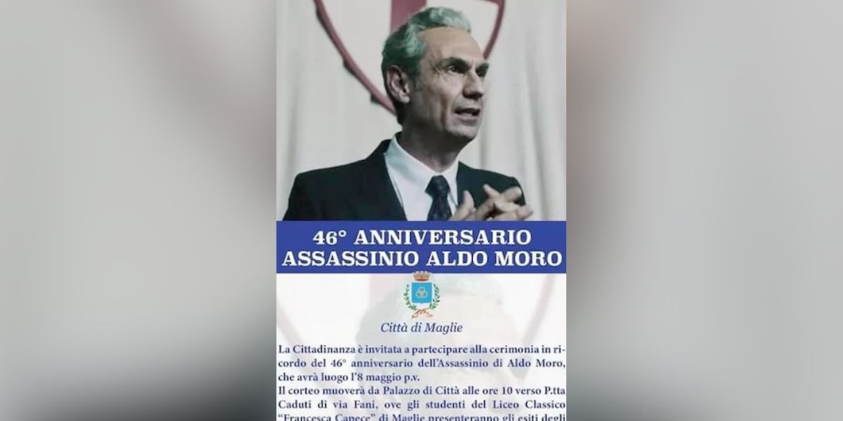 Nei giorni scorsi il comune di Maglie, in provincia di Lecce, ha realizzato alcuni manifesti per commemorare la morte di Aldo Moro, il leader democristiano ucciso dalle Brigate Rosse il 9 maggio del 1978, dopo 55 giorni di prigionia. Lo ha fatto però utilizzando per sbaglio una foto tratta dal film di Marco Bellocchio Esterno notte, in cui Moro era interpretato dall’attore Fabrizio Gifuni. I manifesti erano stati affissi nelle strade della città, dove Moro peraltro nacque, e pubblicati anche sui canali social del comune.