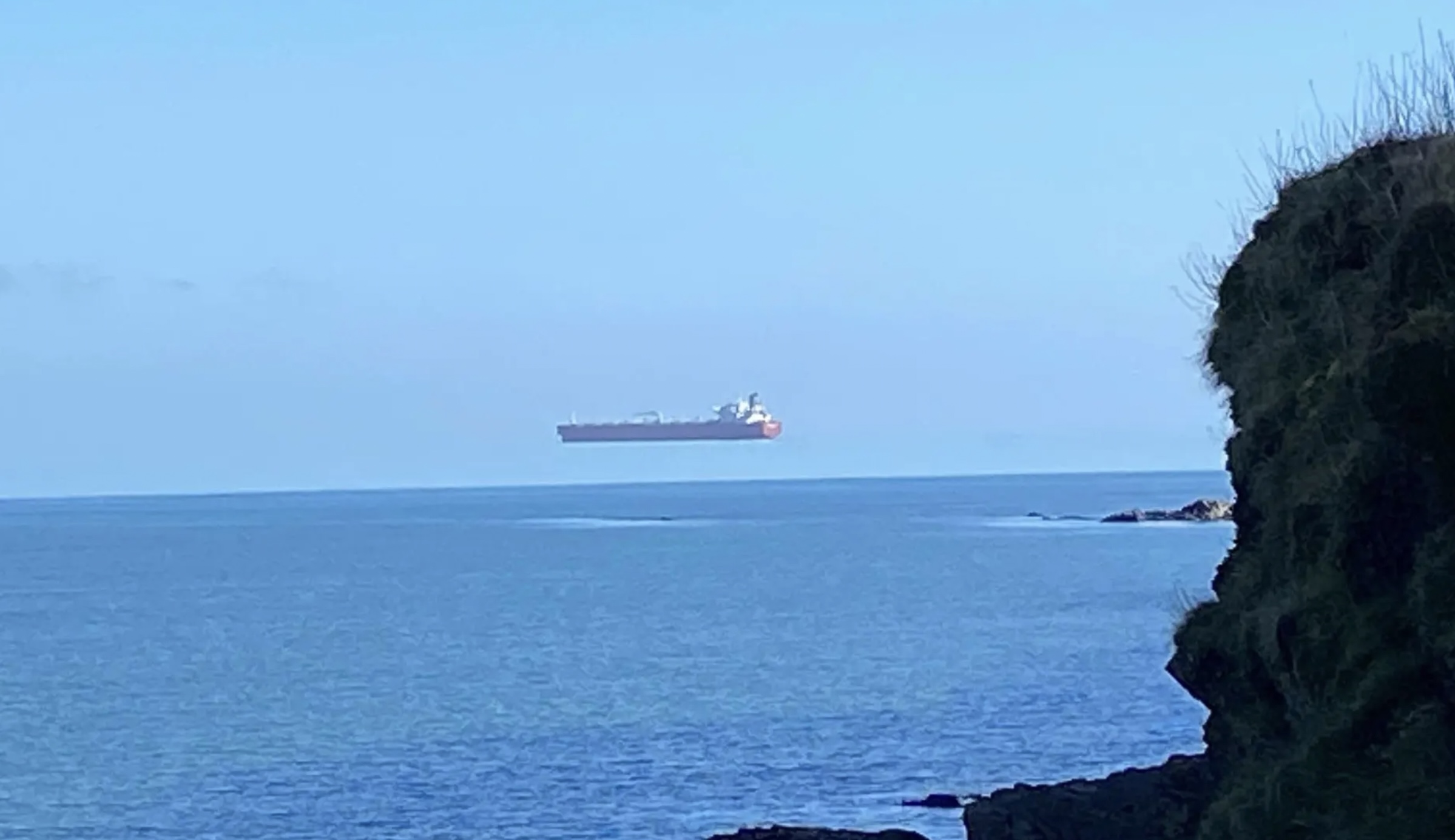 Durante una passeggiata nei pressi di Falmouth, nel sud dell’Inghilterra, un uomo ha fotografato una nave mercantile che sembrava essere sospesa sopra le acque del mare. Era ovviamente un’illusione ottica, dovuta a un falso orizzonte, creato dalla nebbia o dalla foschia sopra il mare – un fenomeno diverso da quello dei miraggi delle oasi nei deserti, che vengono avvistate lontano da dove si trovano in realtà.