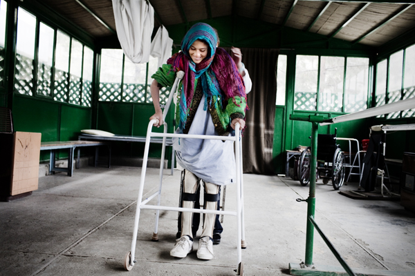 Alberto Cairo, che gestisce i programmi ortopedici della Croce Rossa a Kabul, ci ha spiegato che “una scheggia le ha colpito e danneggiato il midollo spinale, paralizzandola dalla vita in giù (perdita di movimento, sensibilità, controllo urinario e fecale…). Ha anche subito la frattura di un gomito. L’osso si è saldato, ma il braccio ha una funzionalità limitata, una tragedia considerando la paralisi alle gambe. Con dei tutori può stare in piedi e muovere qualche passo appoggiandosi a un deambulatore. Ha davanti a sè una vita difficilissima”.