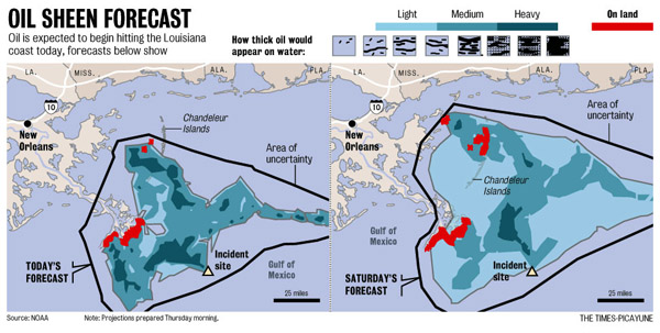 Il Times-Picayune di New Orleans ha aggiornato stamattina la sua grafica sull’estensione e i movimenti della fuoriuscita di petrolio davanti alle coste della Louisiana